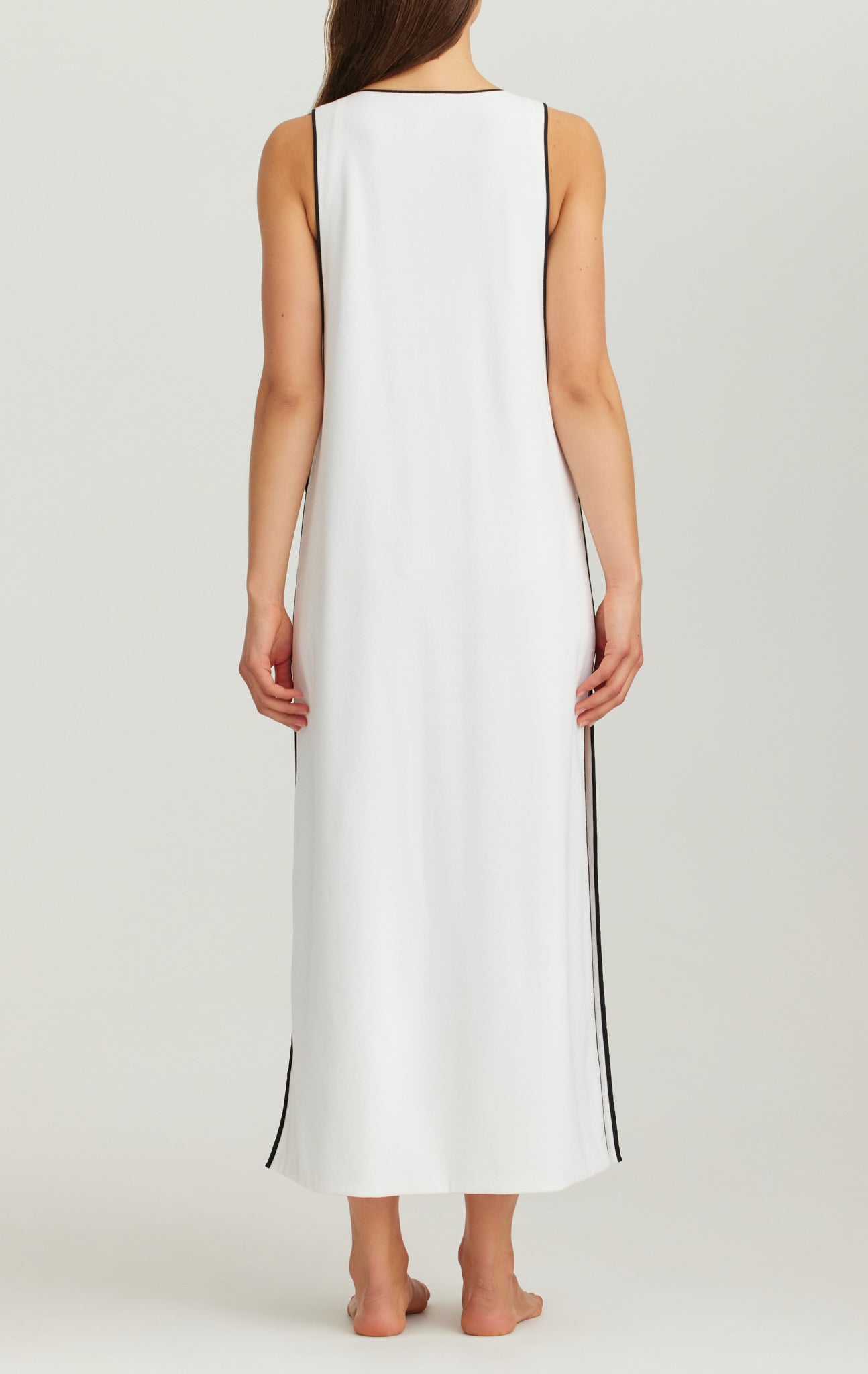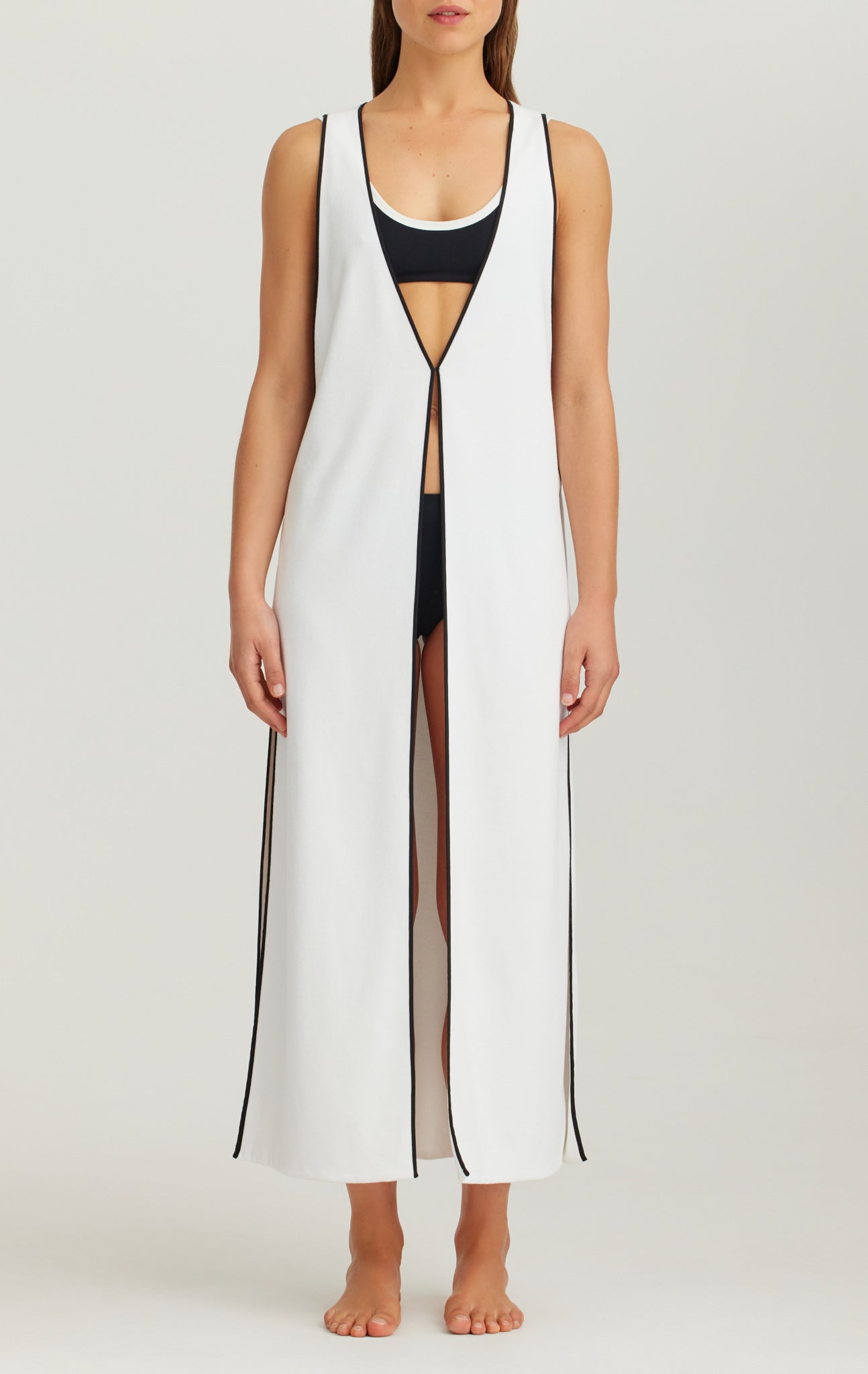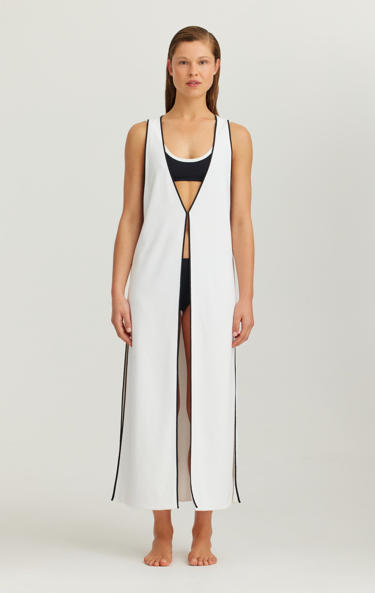 The Aalto Tunic is a new addition to the Terry collection. The tunic features a deep v-neckline, slits at the legs, and a hook and eye closure. It is refined with contrast piping along its trim. This is perfect to wear over any of our swimwear. Featured in our classic Coconut colorway.
